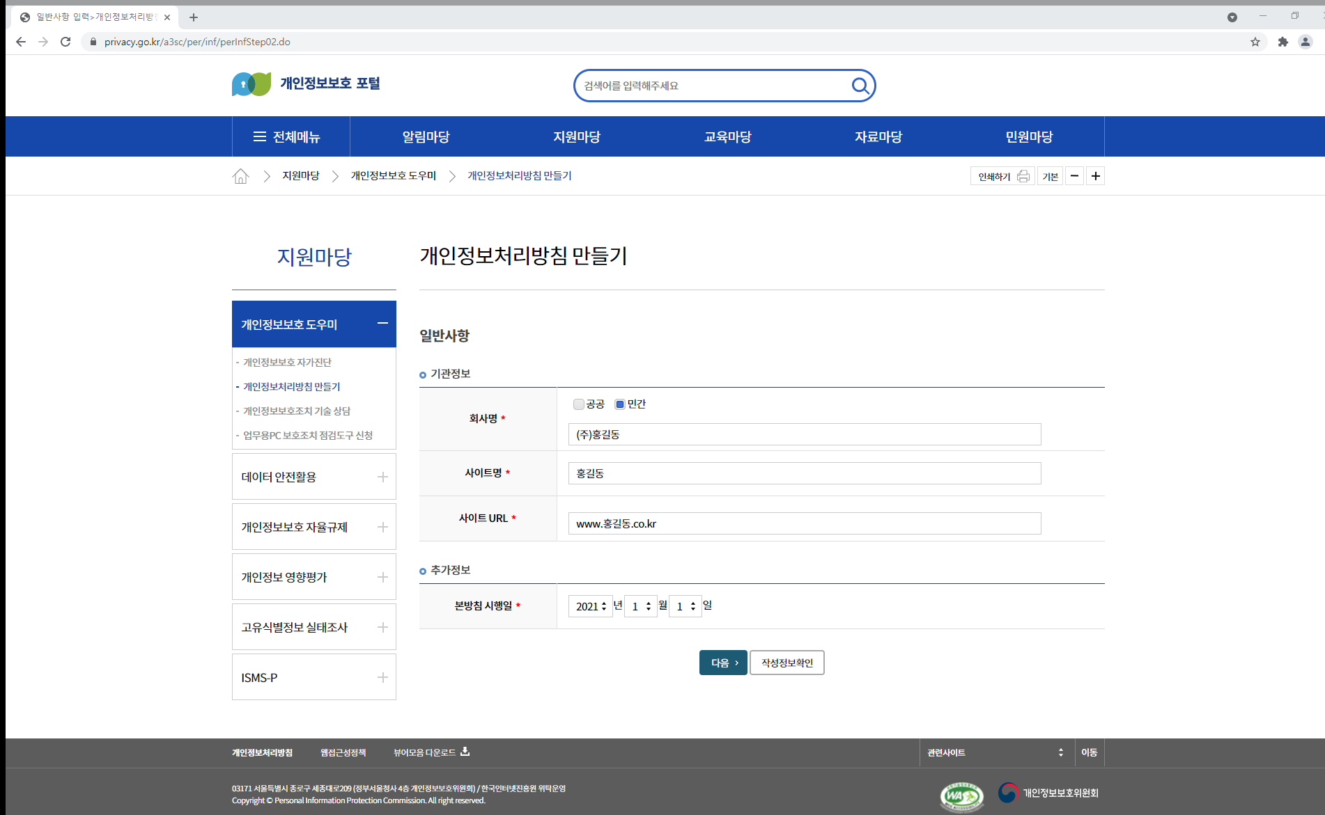 3. 기관명, 사이트명, 사이트 URL 및 처리방침 시행일을 입력 후 다음을 클릭합니다.