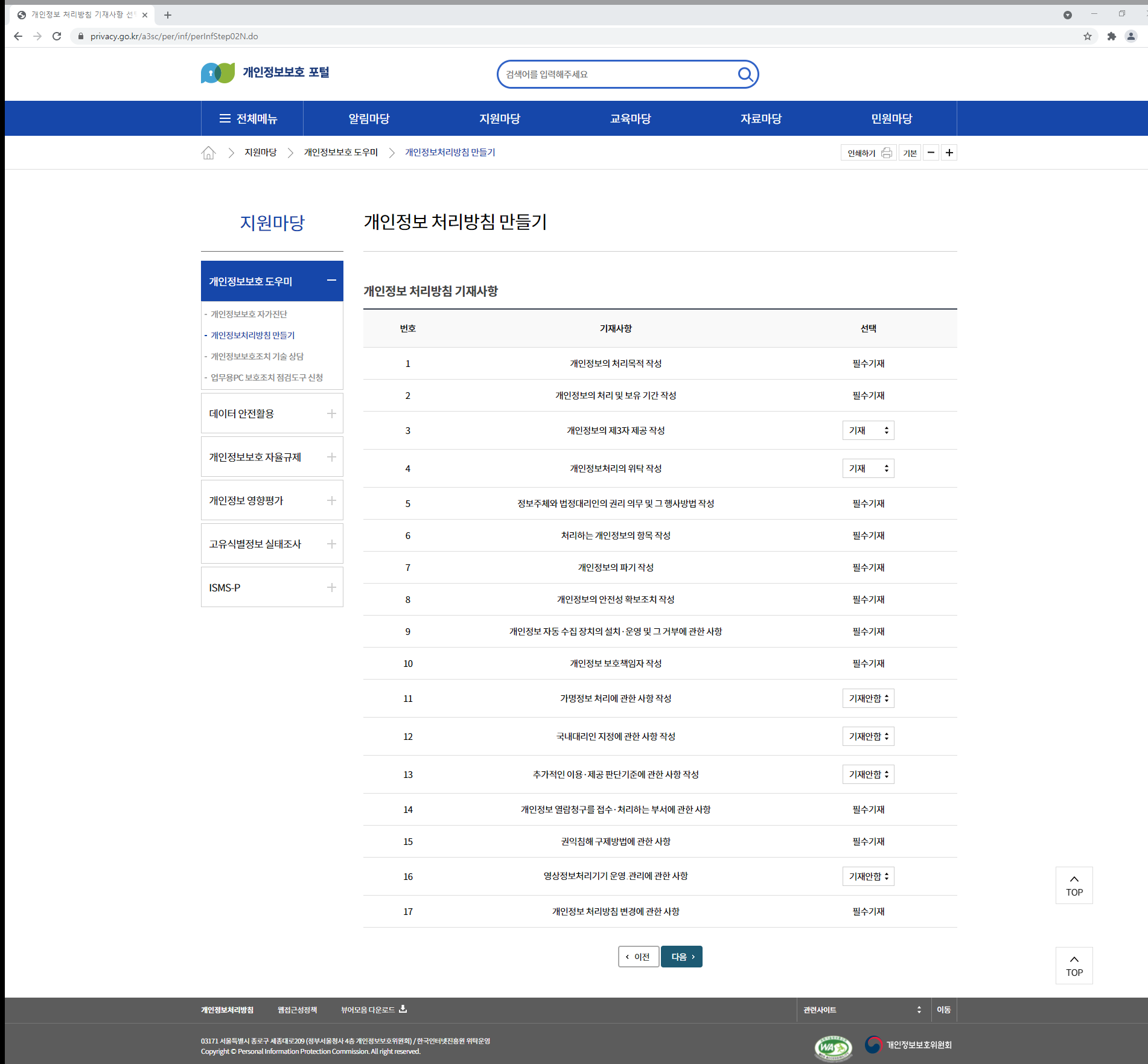 4. 개인정보 처리방침에 들어갈 필수 내용을 선택합니다. 필수로 들어가야 할 내용은 선택이 불가하며, 필수가 아닌 사항은 기재 또는 기재안함을 선택할 수 있습니다.