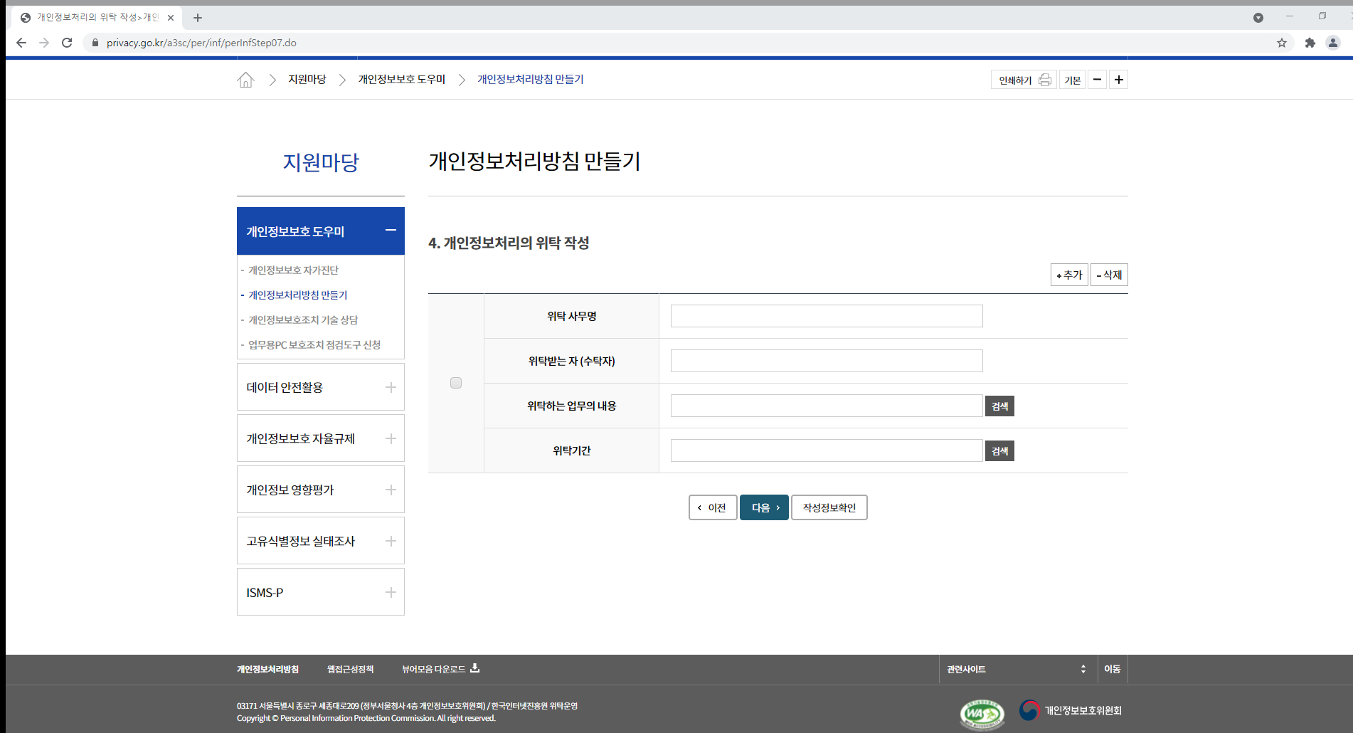 8. 개인정보처리의 위탁 내용을 작성합니다.