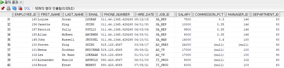 MAX는 최대값을 출력하는 함수, MIN은 최소값을 출력하는 함수. 모든 데이터 타입에 대해 MAX, MIN 함수를 사용할 수 있음. [사용법] MAX(열 이름) / MIN(열 이름) 예시> employees 테이블에서 salary의 최대값과 최소값, first_nam의 최대값과 최소값을 출력해 보세요. SELECT MAX(salary) 최대값, MIN(salary) 최소값, MAX(first_name) 최대문자값, MIN(first_name) 최소문자값 FROM employees; [실행결과]